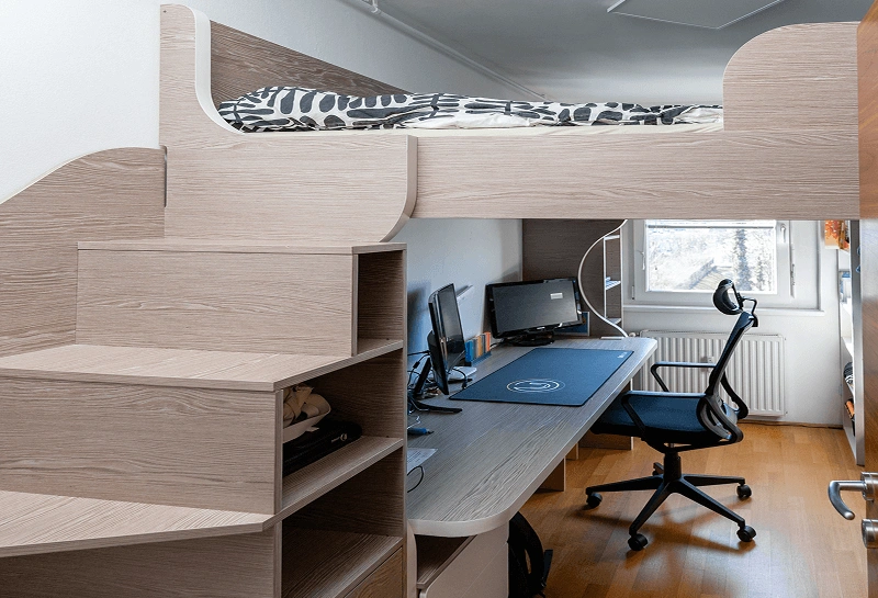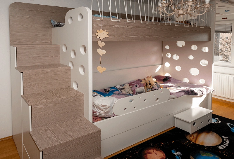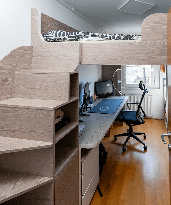 A play space is a world of creativity and carefree joy, where children explore, learn, and dream of great adventures. At Silvan MGA, we craft durable furniture using solid wood, plywood, and MDF, finished with environmentally friendly paints and varnishes — all tailored to children of all ages, from toddlers to teenagers. Beyond beds, wardrobes, and desks, we incorporate playful elements like climbing walls, poles, or slides to encourage movement and physical development.