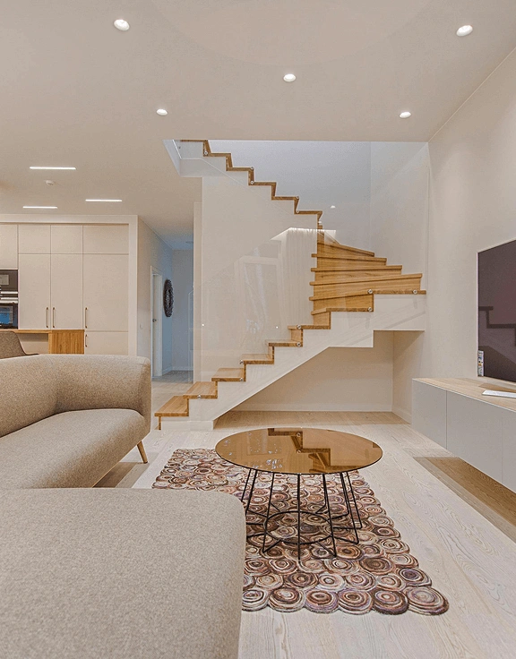 Studies show that staircases often serve as a central feature in interior design, which is why we enhance them with elements such as glass railings for a light, airy look or metal accents for an industrial touch. Rounded edges and perfect alignment with flooring ensure both comfort and safety, while subtle, integrated lighting adds a sense of luxury. In this way, staircases become more than just a passage — they become a bold expression of style, accompanying you with elegance at every step.