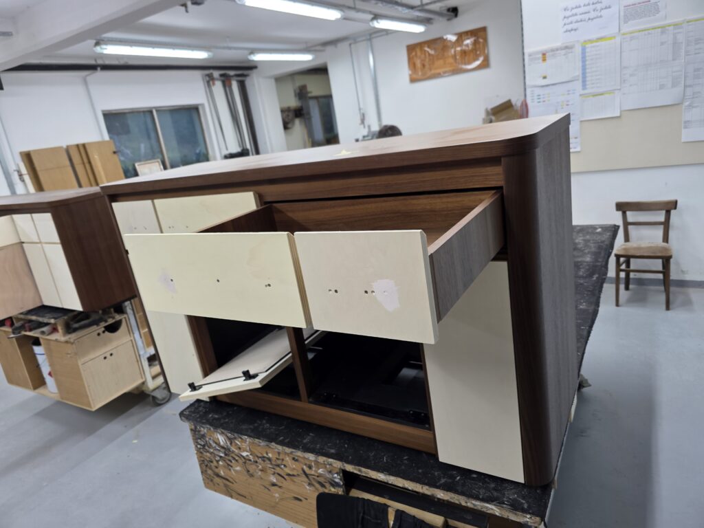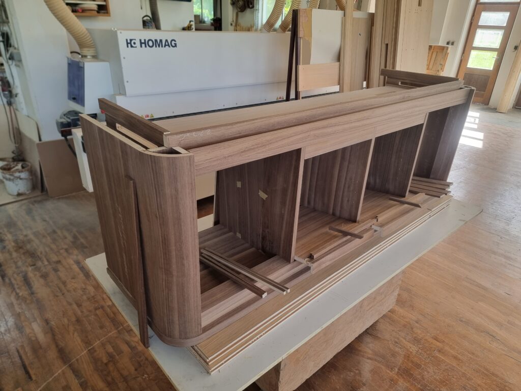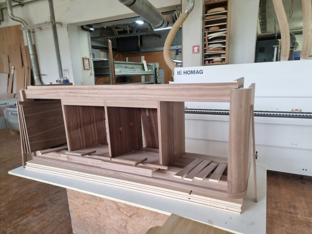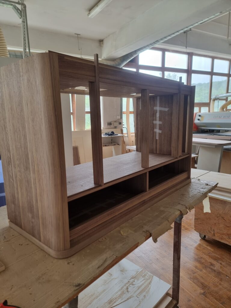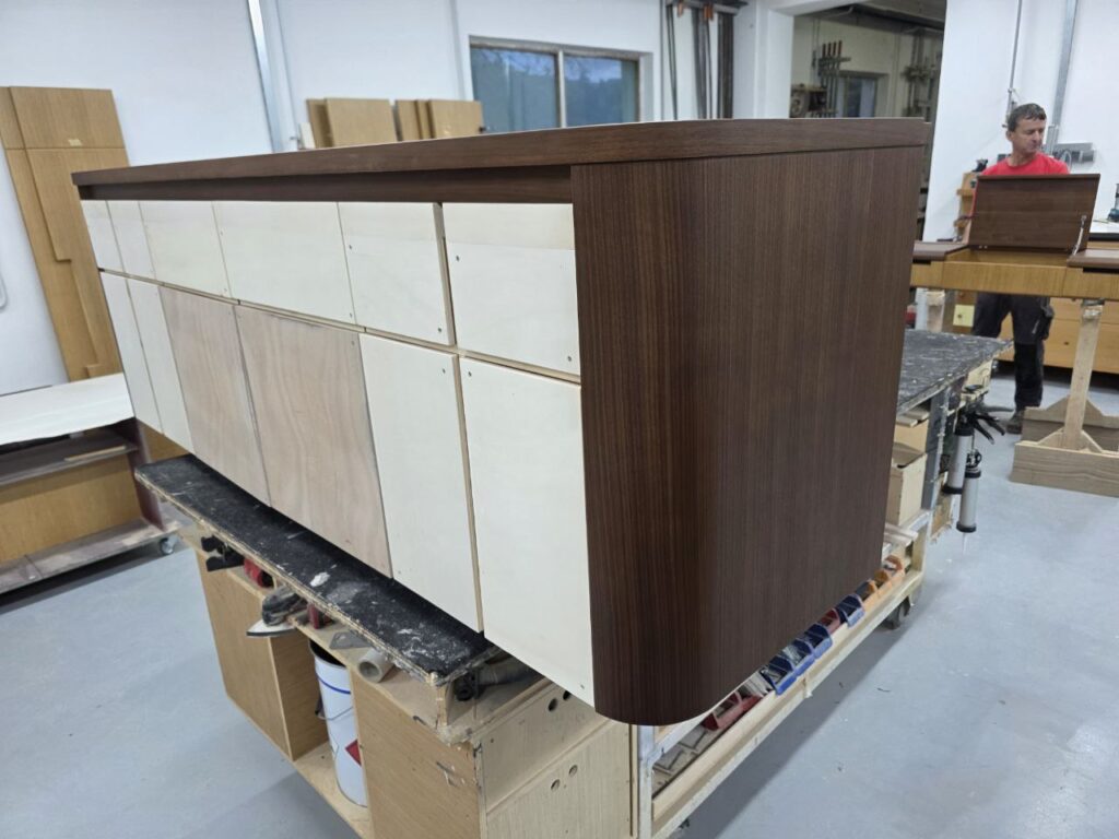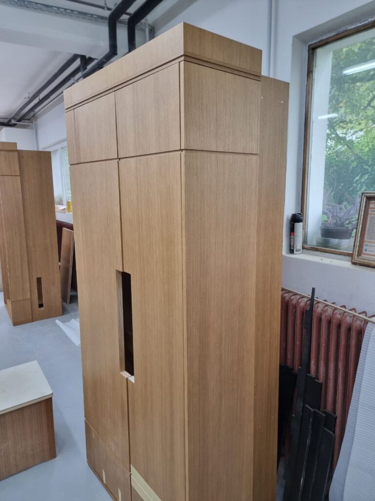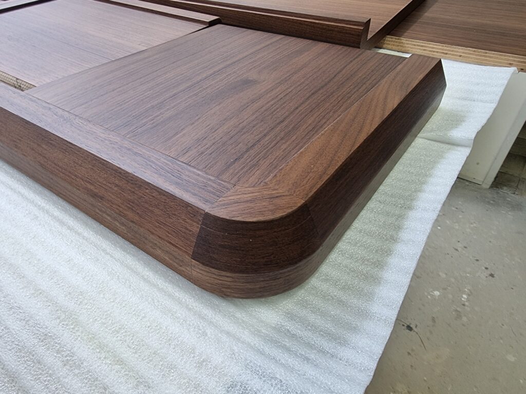 Proizvodnja pohištva za 50m barko. Material furnir oreh in hrast fornte pred pripravljene za tapeciranje in costum ročaje.