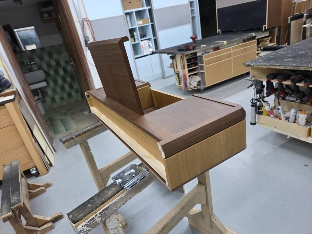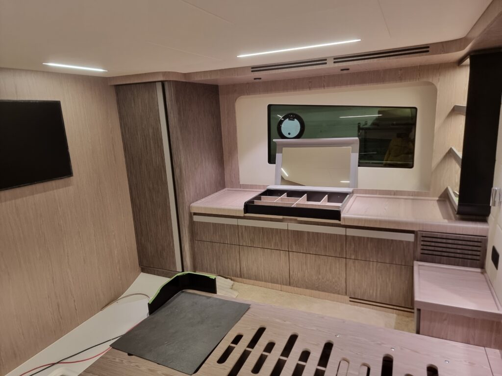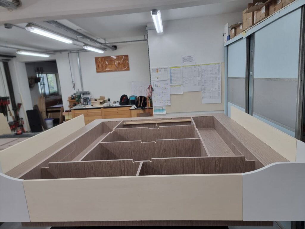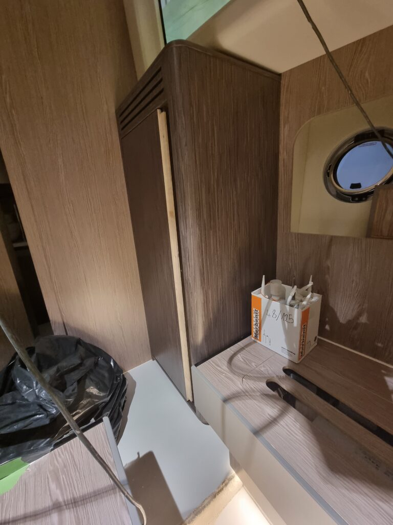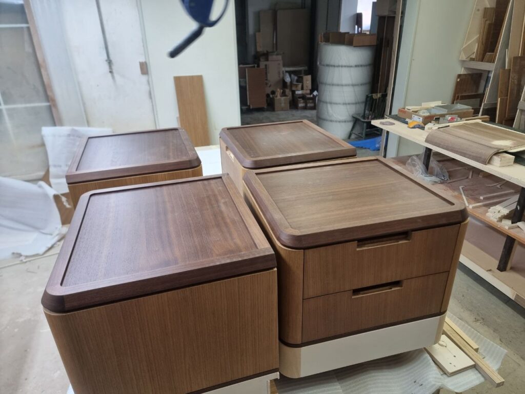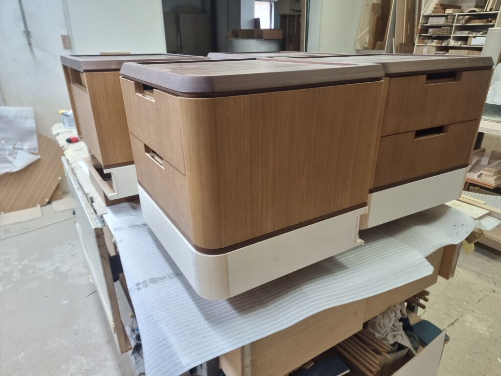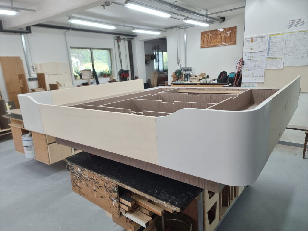 Proizvodnja pohištva za 50m barko. Material furnir oreh in hrast fornte pred pripravljene za tapeciranje in costum ročaje.