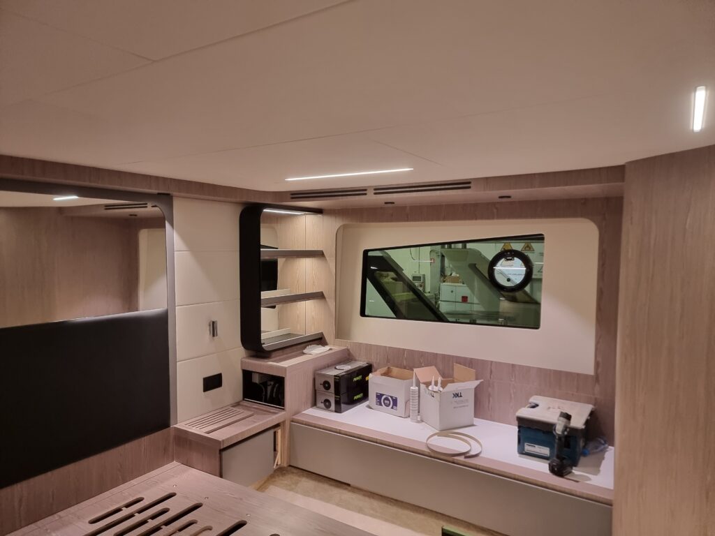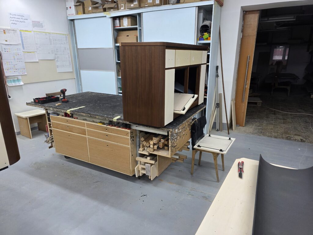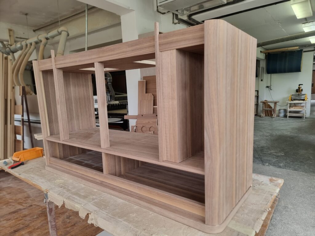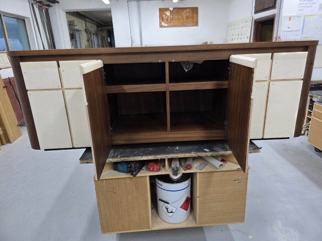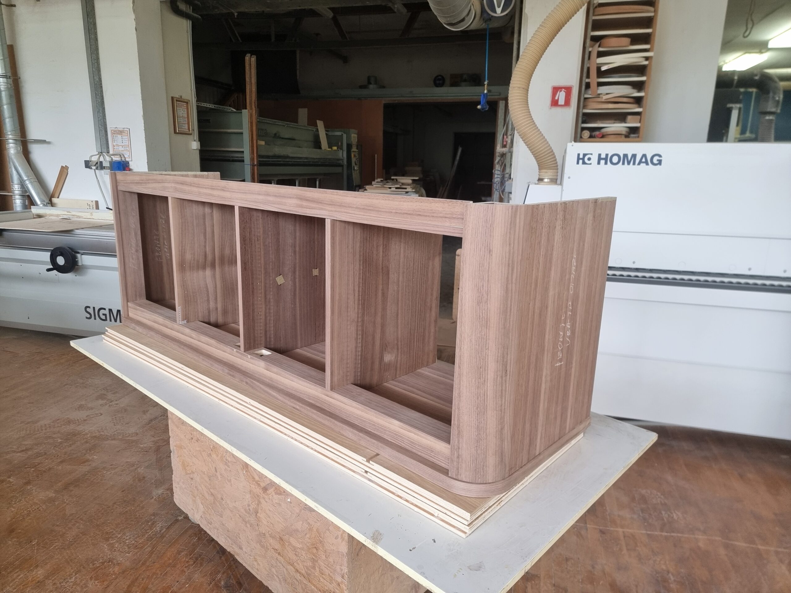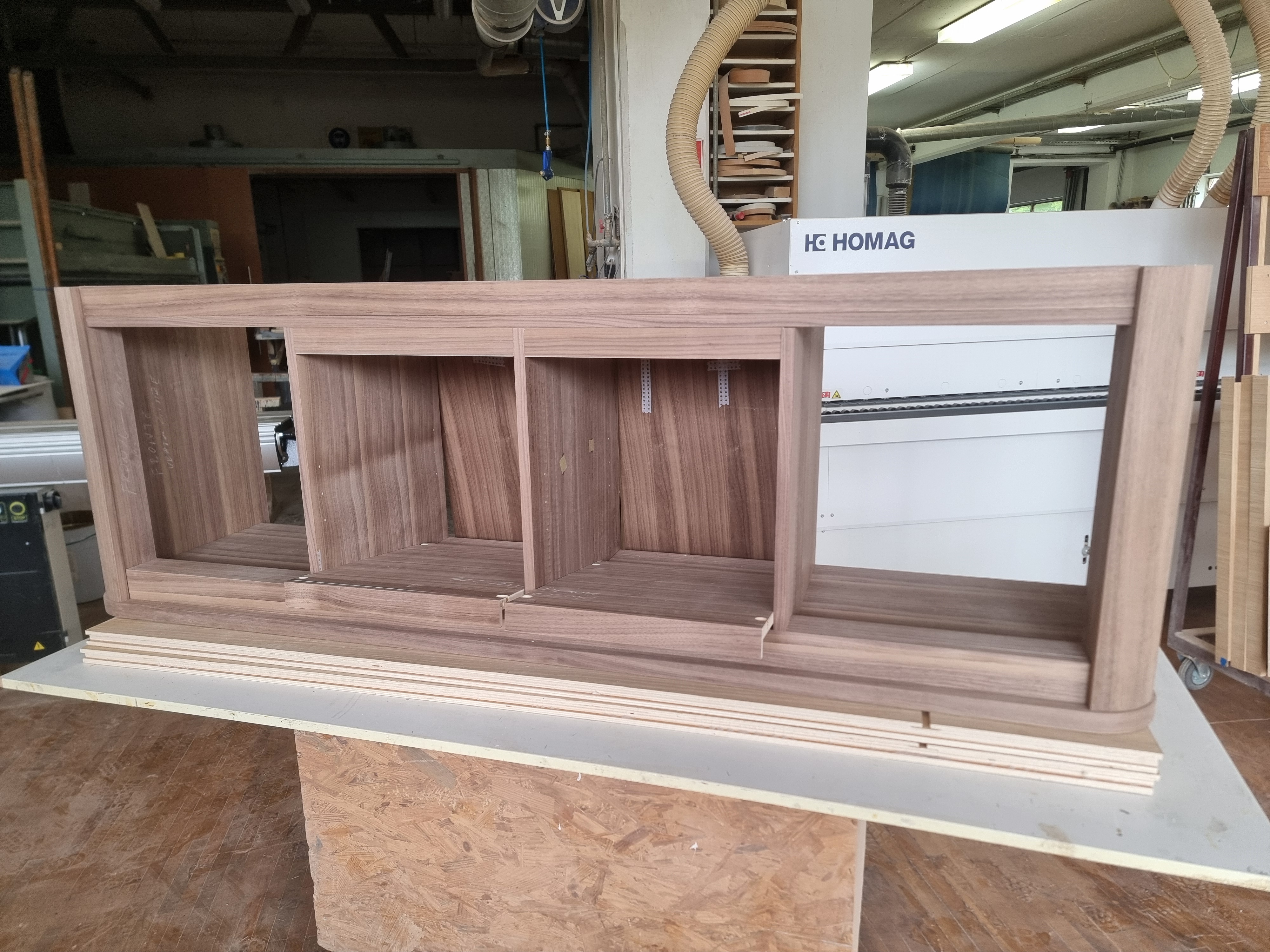 Proizvodnja pohištva za 50m barko. Material furnir oreh in hrast fornte pred pripravljene za tapeciranje in costum ročaje.